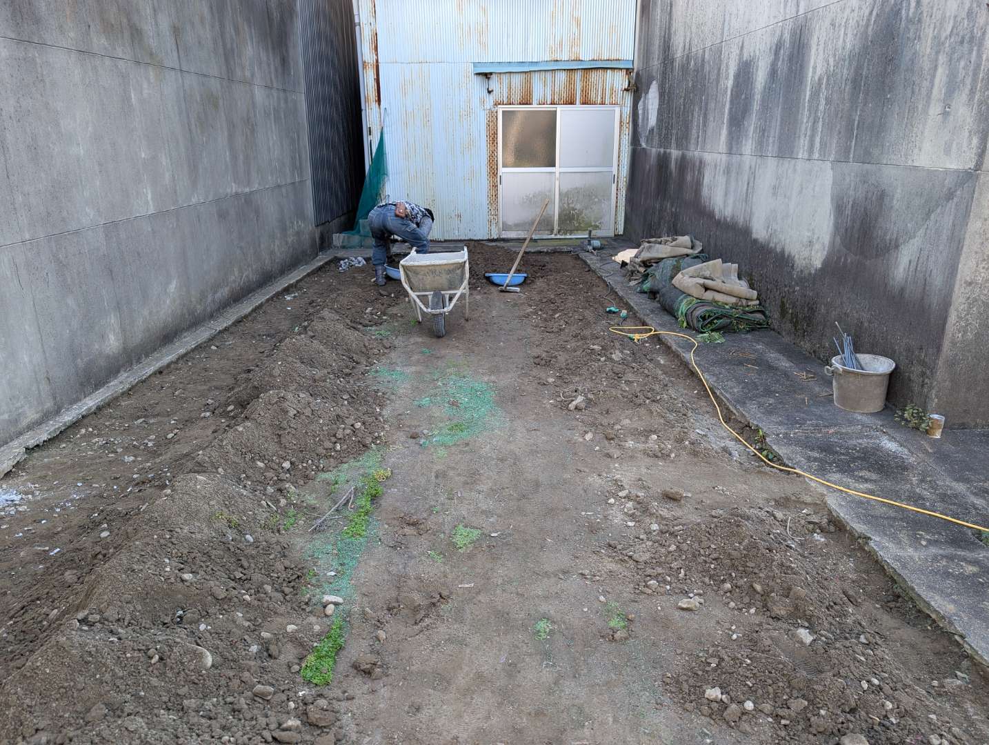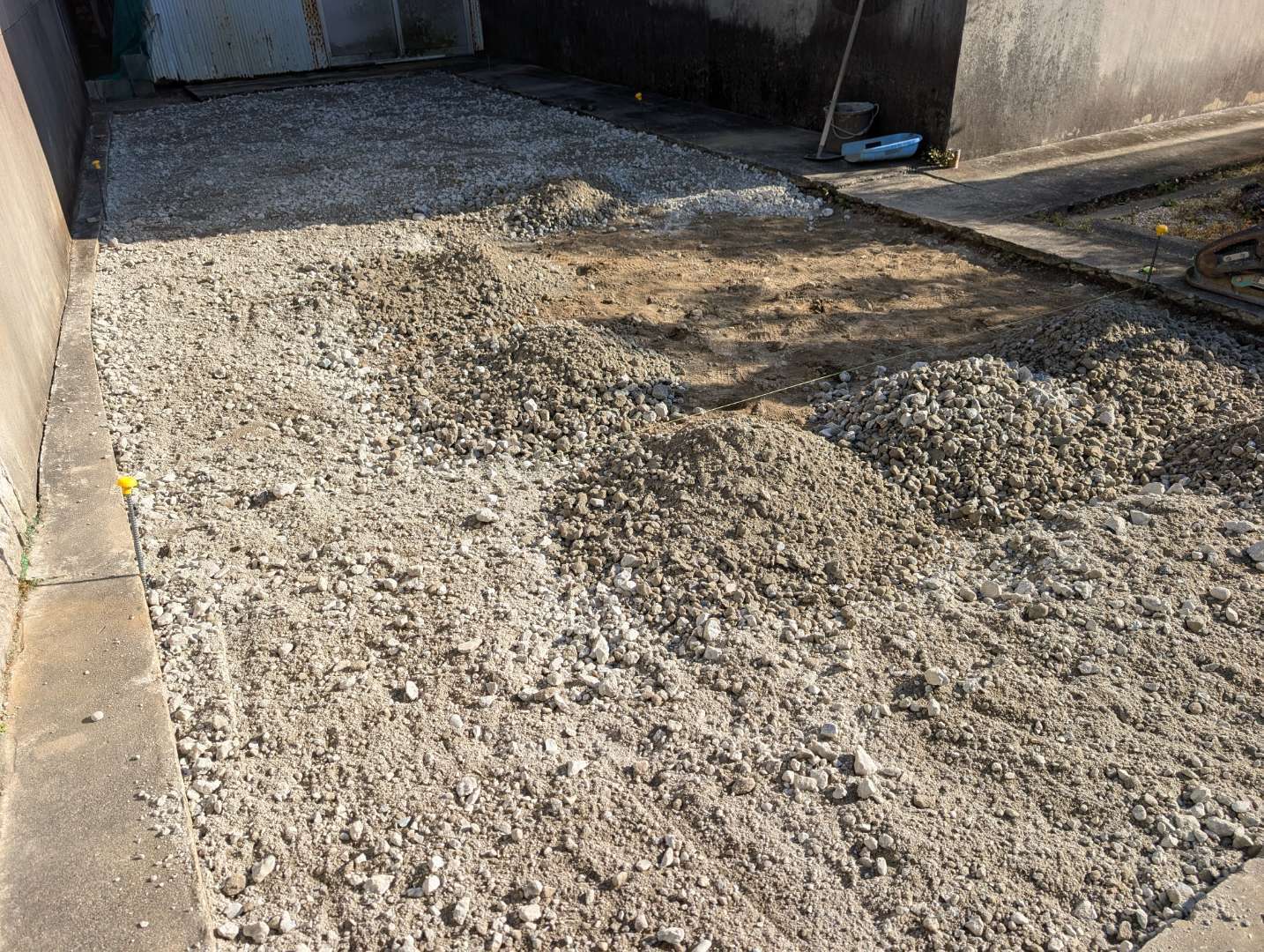 既存の人工芝を剥がして土を鋤取り、下地の砕石と不陸調整の砂を敷き詰めて施工しました!