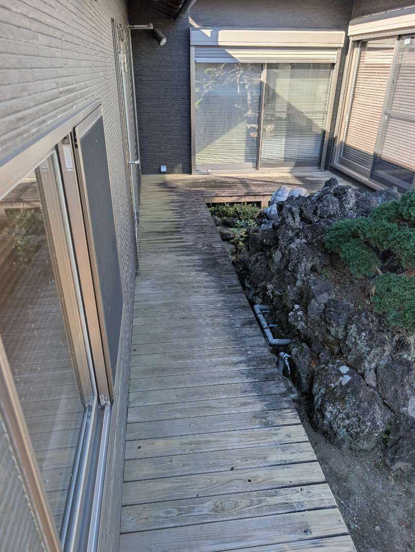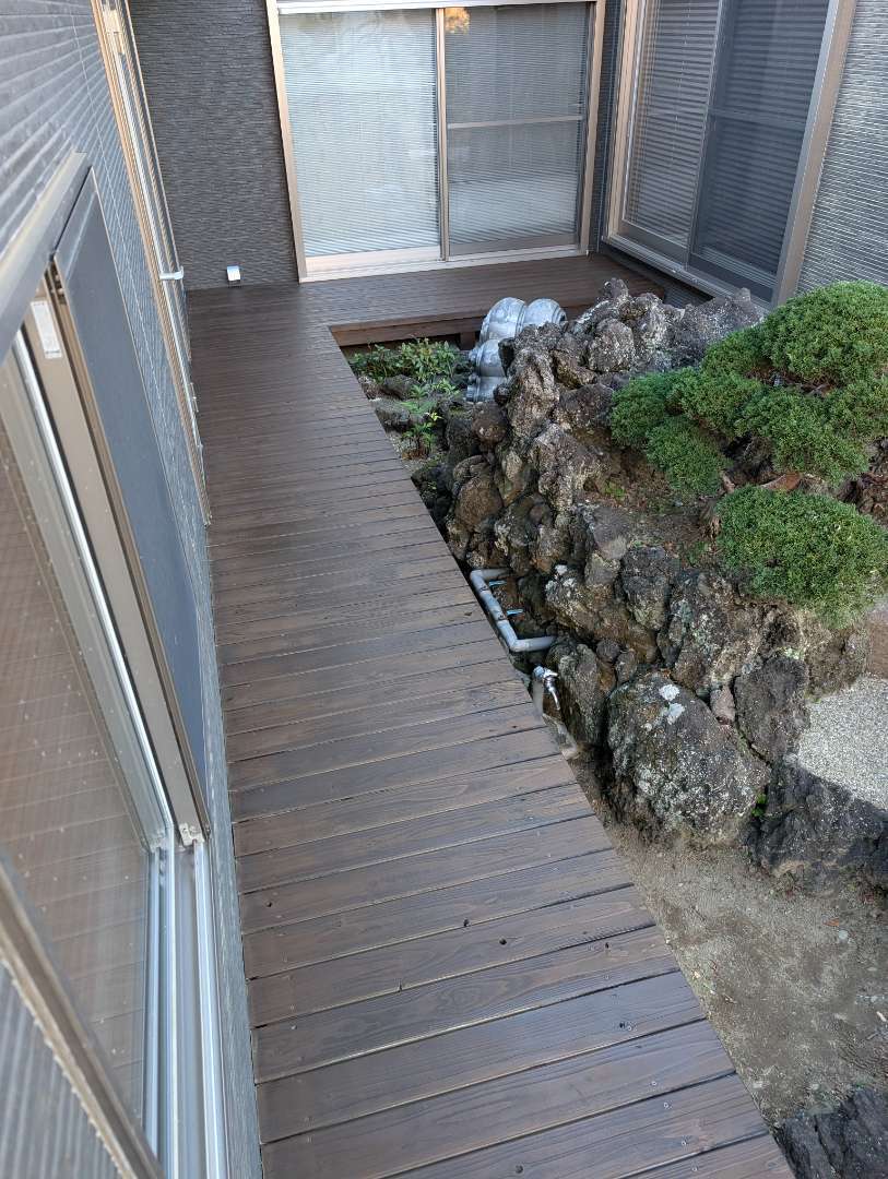 中学生時代の恩師から相談を受け、庭へ人工芝敷設とウッドデッキのメンテナンス工事を行いました✨️